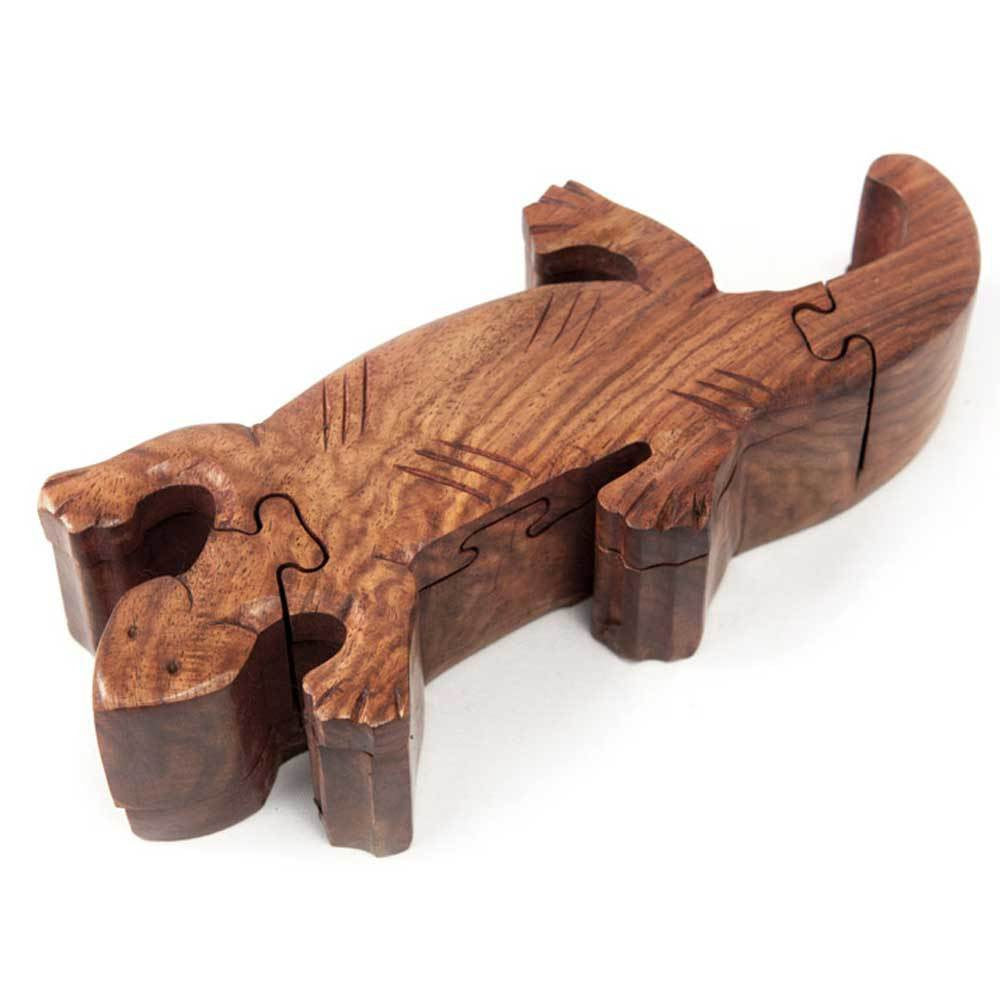 This gecko is a fun, 3D puzzle made of shesham wood. This engaging, unique puzzle was hand-carved by talented artisans and has a hidden space inside. Measures 8 by 4 inches