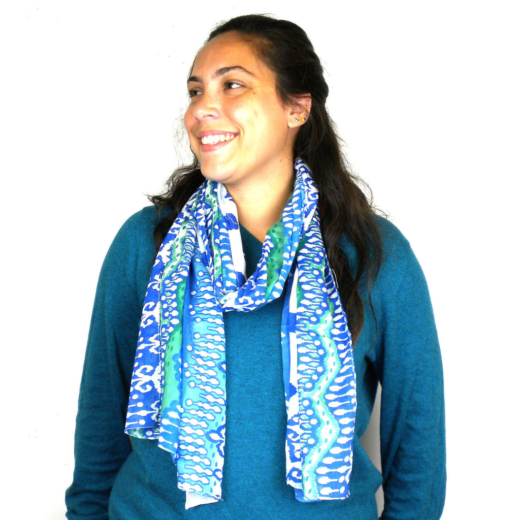Complete your ensemble with a bit of color with a handmade 20 by 70 inch cotton scarf made in India by local artisans. Made of breathable cotton for all-weather wear.